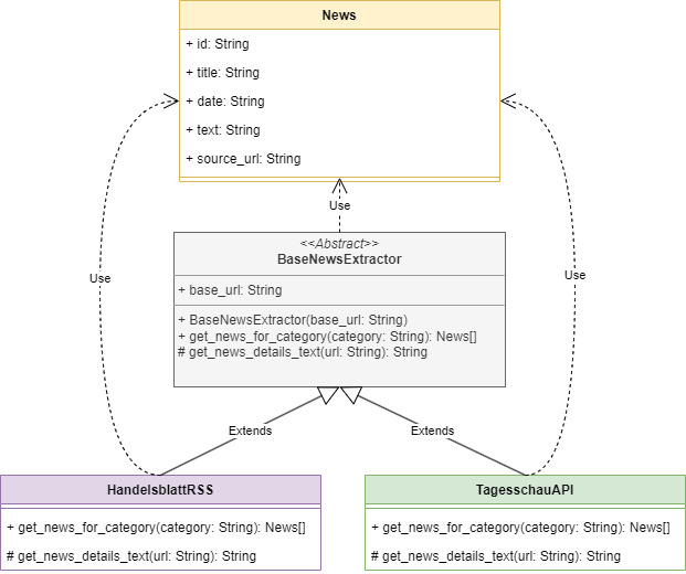 Über die Methode get_news_for_category wird ein Interface geschaffen, über welches die darüberliegende Applikation News aus der in den Kind-Klassen implementierten Quelle beziehen kann. So soll es möglich sein, in der Applikation keine Spezifika der Datenquellen implementieren zu müssen, sondern lediglich auf die bereits kapselnde Klasse zurückzugreifen.