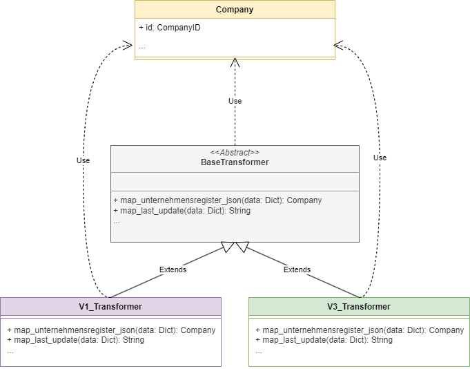 Die Aufbereitungsroutine wurde daher überarbeitet. Ähnlich der Lösung mit dem `BaseNewsExtractor` aus der News-Verarbeitung wurde hier ebenfalls eine Oberklasse (`BaseTransformer`) eingeführt. Diese wird von den Implementierungen `v1` oder `v3` abgeleitet, die jeweils das gleichnamige Datenschema kapseln. Im BaseTransformer werden verschiedene Submethoden definiert, die jeweils einen Aufbereitungsschritt repräsentieren. Diese müssen von der entsprechenden Kindklasse gemäß des Datenschemas implementiert werden.