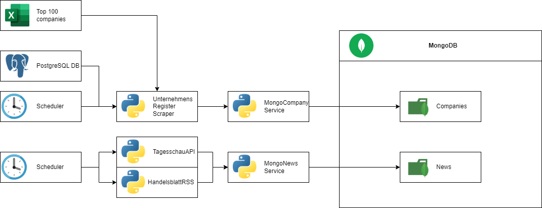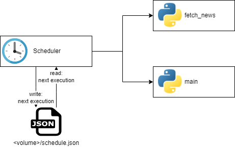 Dieser Container, als ingest in den beiden docker-compose-Dateien des Projekts zu finden, greift auf bestehende Applikationen/Funktionen im Bereich der Data Extraction zu und kapselt diese im Scheduler. Der Scheduler stellt eine Erweiterung zum bereits existierenden schedule-Paket dar und bietet zusätzlich die Funktion, die nächste Ausführung in einer Datei zu persistieren. Dadurch überlebt er beispielsweise das erneute Deployment der Applikation und startet mit dem gleichen Intervall ausgehend von der tatsächlich letzten Ausführung. Ohne diese Funktion würde das gesetzte Intervall nach jedem Deployment von Neuem starten. Dies hätte in der Hochphase der Entwicklung dazu geführt, dass das gewünschte Intervall nie erreicht werden kann, da in der Zwischenzeit immer wieder eine neue Version deployed wird.